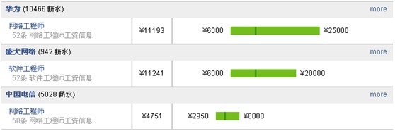 网络工程师的平均薪资要低于软件工程师和售前工程师,但是有的企业开出的薪资也是比较高的,如华为的网络工程师月薪在25000元/月,基本上和软件开发的持平。